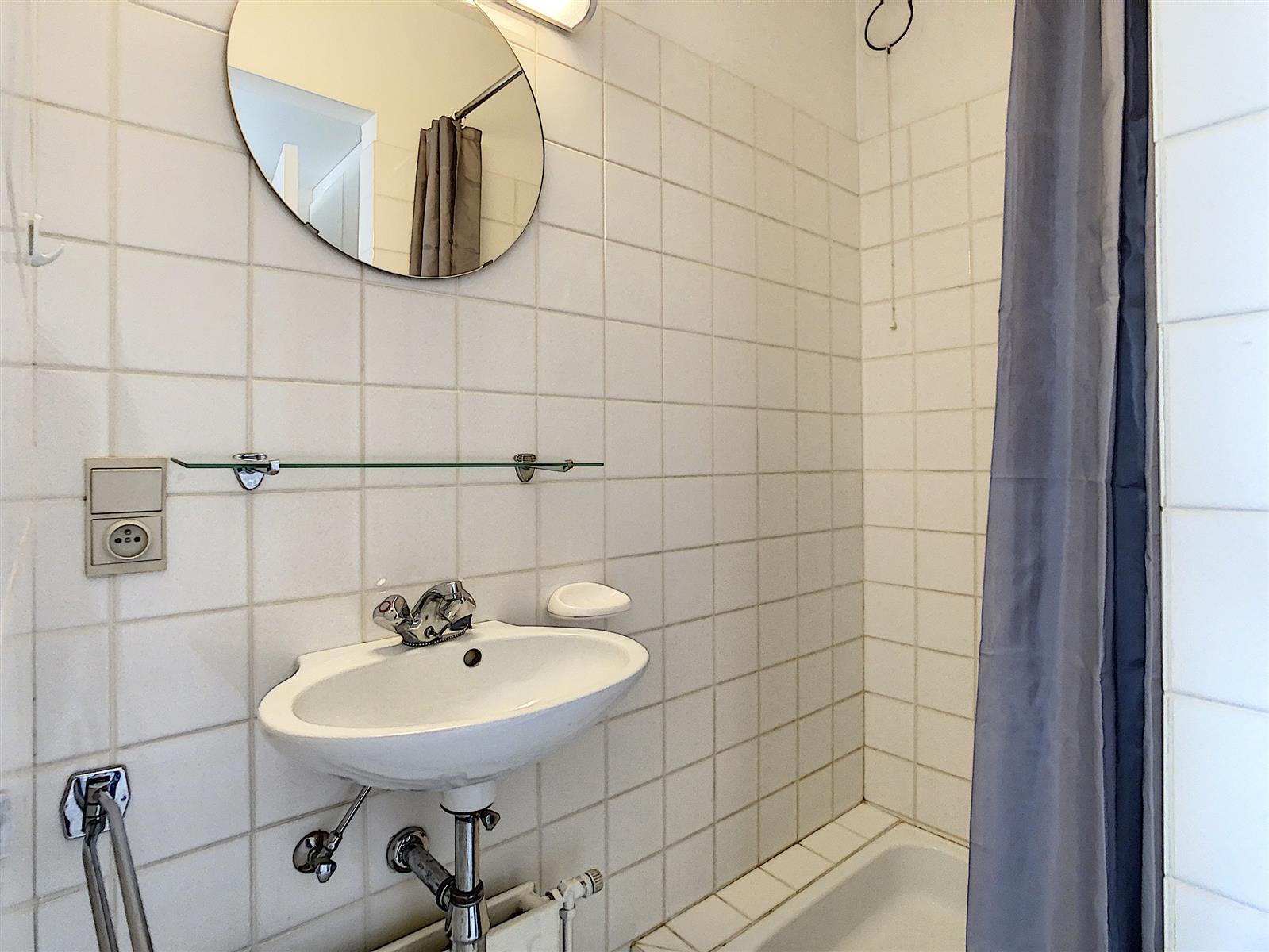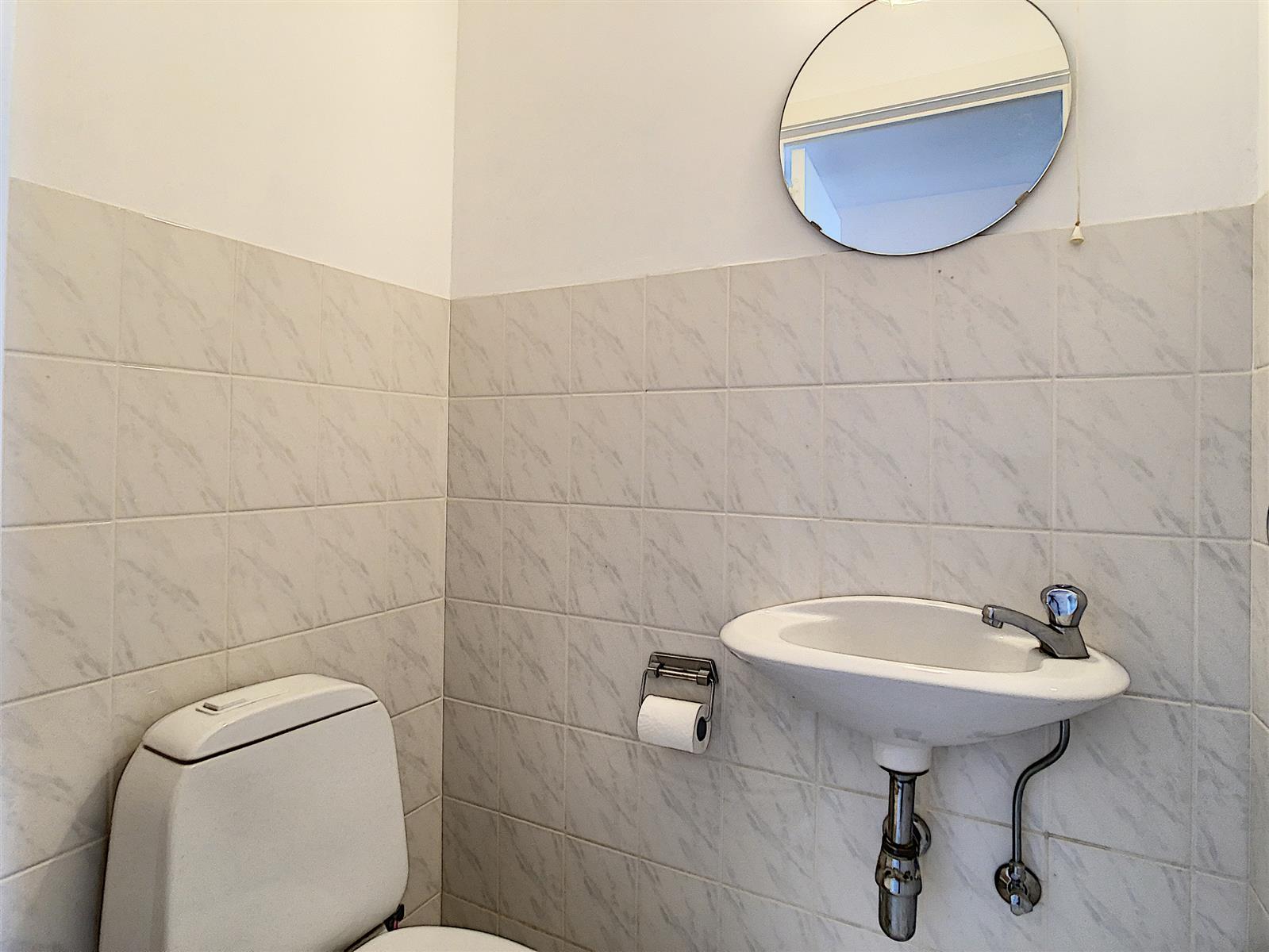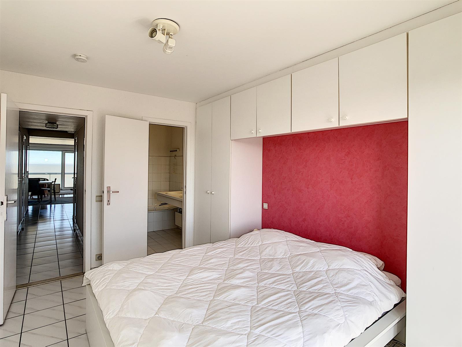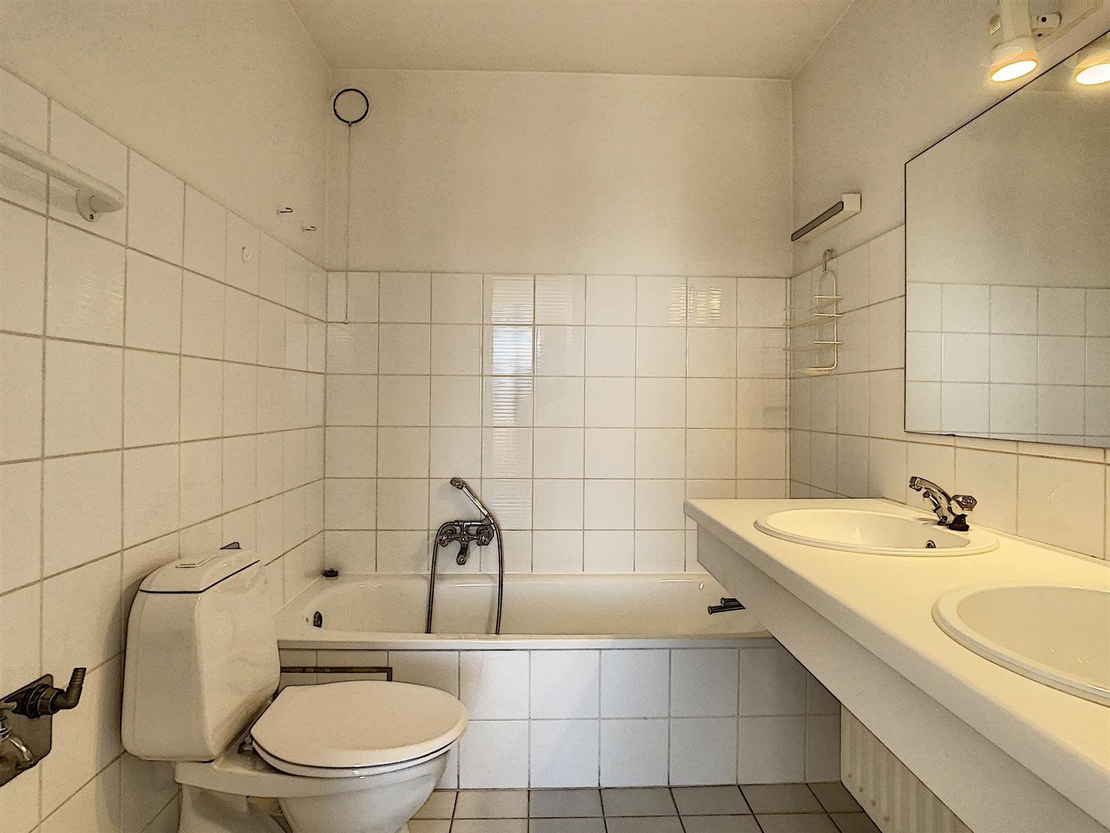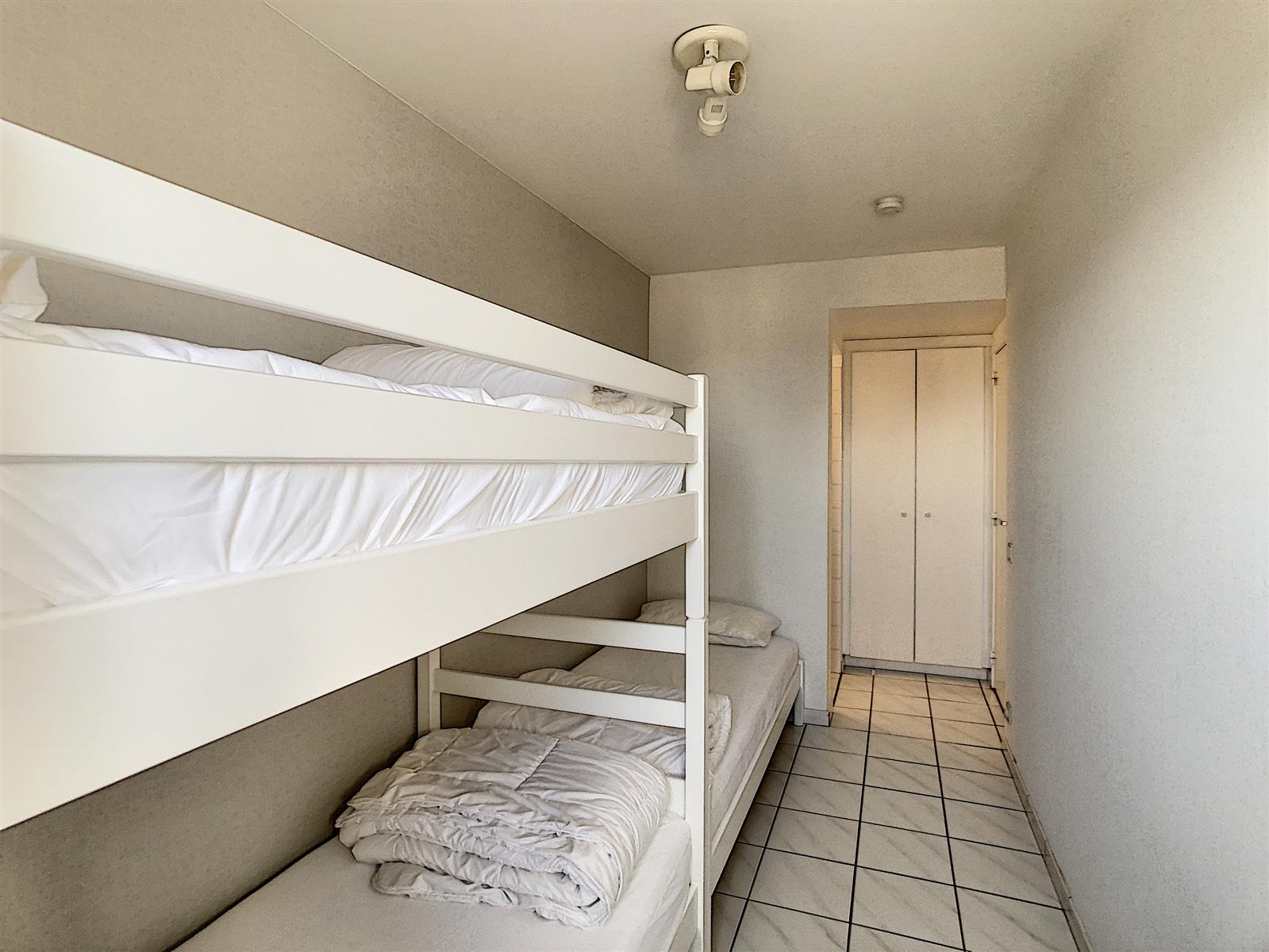 Het appartement bestaat uit: woonkamer met terras vooraan – keuken – toilet – twee slaapkamers waarvan één met badkamer met ligbad, dubbele lavabo en toilet, de andere slaapkamer met douchekamer met douche en lavabo – terras achteraan.