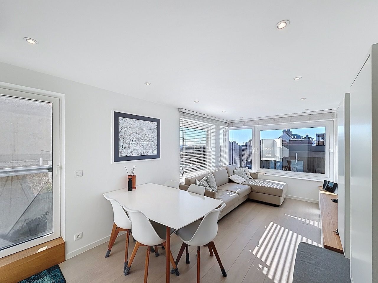 Het gelijkvloers appartement omvat een inkomhal met kleine bergkast, vooraan vinden we een lichte woonkamer met travertin vloer die rechtstreeks uitgeeft op de Zeedijk. Er is een vernieuwde en volledig uitgeruste keuken. In de hall is er een aparte toiletruimte met daarnaast een badkamer voorzien van een ligbad met enkele lavabo. Achteraan vinden we twee volwaardige slaapkamers die uitgeven op een zuidgericht balkon. Tot slot is er nog een derde slaaphoek met aansluiting voor een wasmachine en een private kelder. De centrale verwarming is op gas / niet condenserend. In het appartement werden de ramen voor en achter recent vernieuwd door pvc ramen.