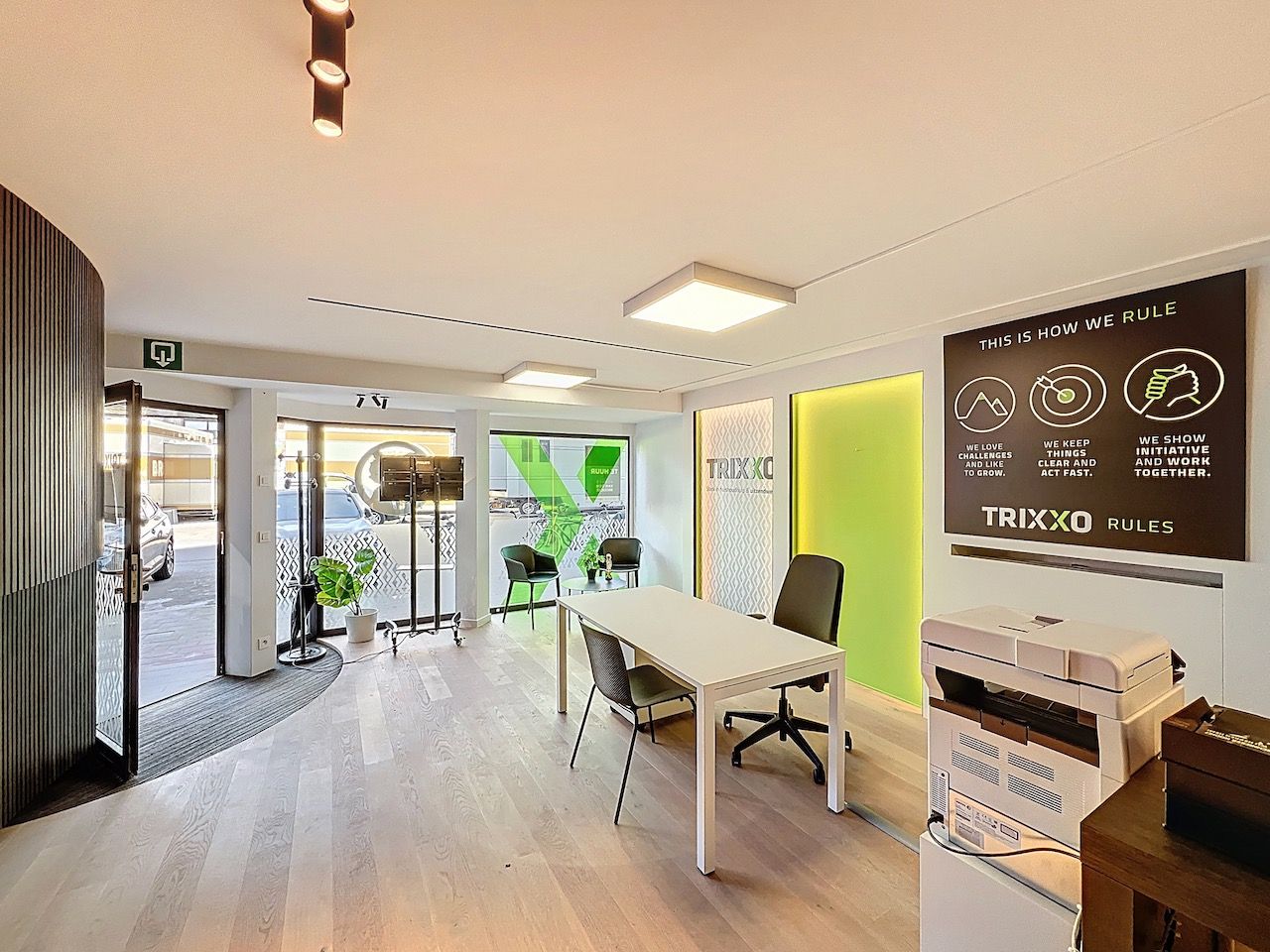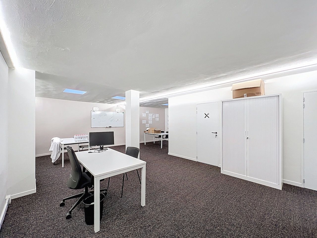 Achteraan bevindt zich een multifunctionele ruimte die flexibel kan worden ingericht naargelang de noden van uw activiteit. Verder is er een gesloten keuken met aansluitend een halletje en een toilet, evenals een praktische kleine berging.